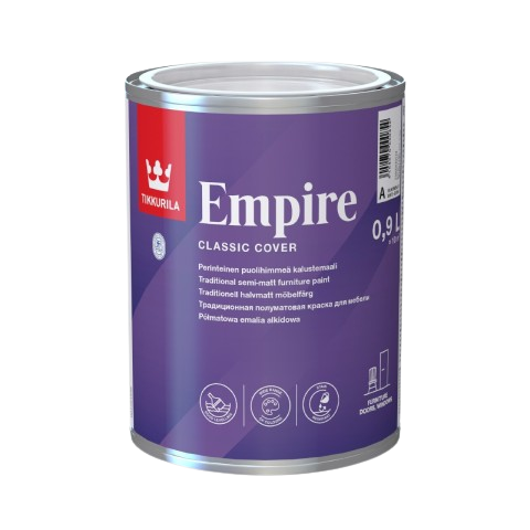 Tiksotropowa farba alkidowa przeznaczona do malowania drewnianych i metalowych powierzchni wewnątrz oraz na zewnątrz pomieszczeń według instrukcji. Elementy użytkowe takie jak meble, ogrodzenia, drabiny, balustrady, maszty, stelaże itp. Tikkurila Empire wyrównuje powierzchnię i jest idealna do aplikacji pędzlem.